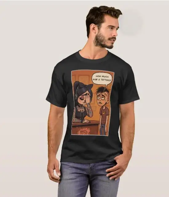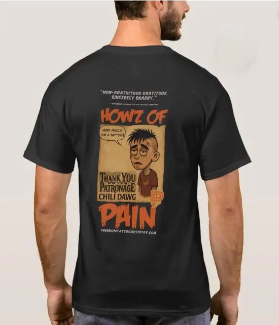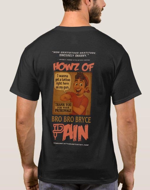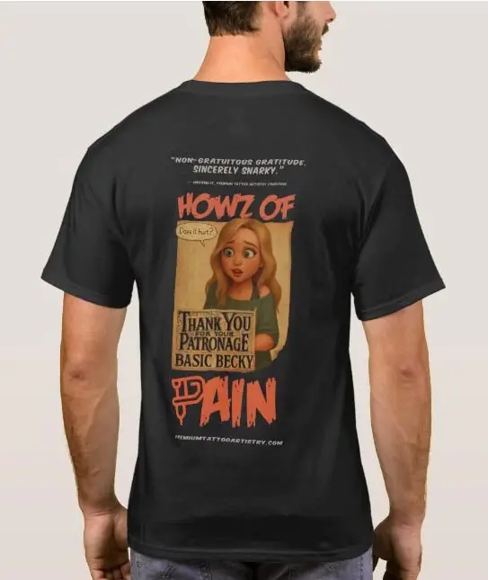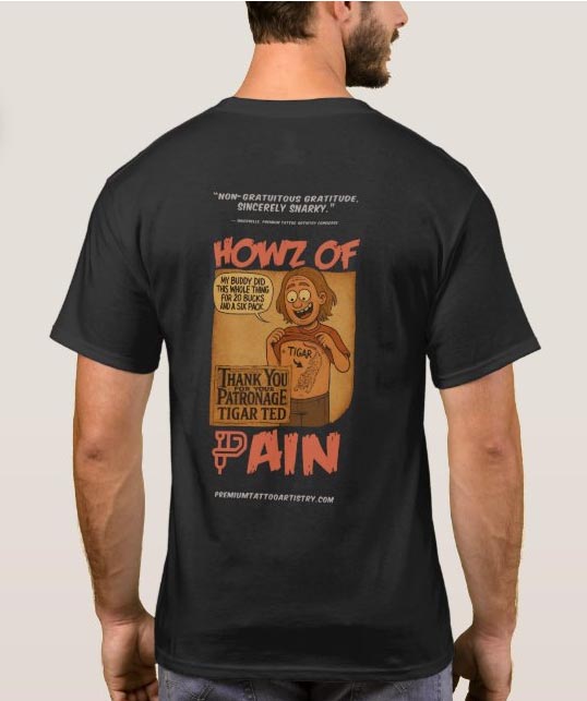 Back Design: The back print features PREMIUMTATTOOARTISTRY.COM and the Howz of Pain signature: “Thank you for your patronage.” It’s a clean, satirical nod to the shop experience