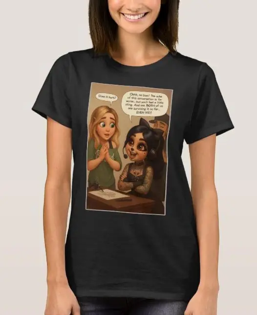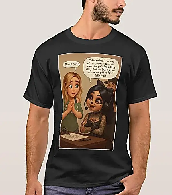 Front Design: Meet Basic Becky — the wide-eyed wonder of tattoo shop hesitation. This Howz of Pain tribute tee captures her iconic moment: “Does it hurt?” Becky’s anxious expression is framed by distressed red “HOWZ OF” and “PAIN” banners, with a bold “THANK YOU FOR YOUR PATRONAGE BASIC BECKY” emblem anchoring the scene. Designed on a women’s black T-shirt cut, it blends comic-book drama with customer service satire — perfect for tattoo artists and shop staff who’ve heard it all.