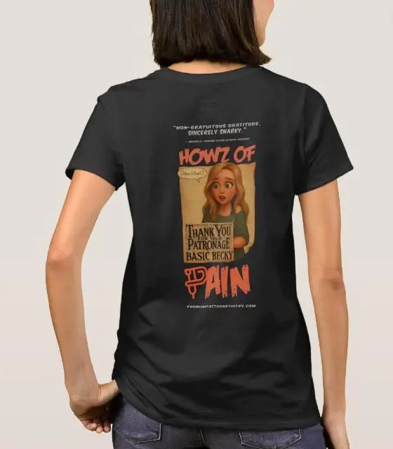 Back Design: PREMIUMTATTOOARTISTRY.COM “Non-gratuitous gratitude. Sincerely snarky.” — Inkerbelle, Premium Tattoo Artistry Concierge Howz Of Pain Thank You For Your Patronage Basic Becky