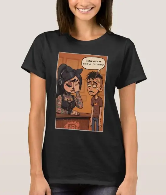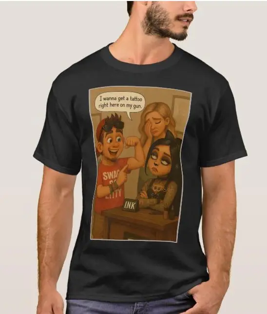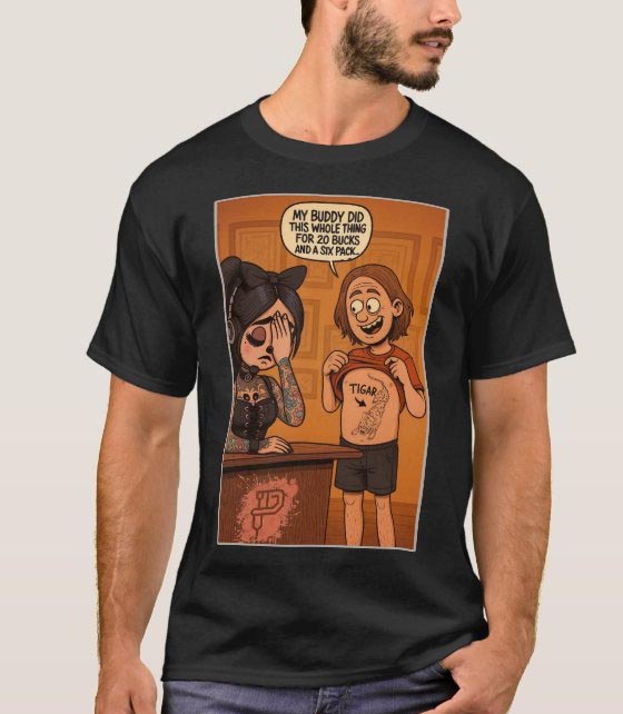 Front Design: Meet Tigar Ted — the proud patron saint of questionable ink. This Howz of Pain tribute tee immortalizes his legendary moment: “MY BUDDY DID THIS WHOLE THING FOR 20 BUCKS AND A SIX PACK..” Ted lifts his shirt to reveal the infamous misspelled “TIGAR” tattoo, a crude tiger sketch, and the eternal reminder of bargain‑basement artistry. Framed by distressed red “HOWZ OF” and “PAIN” banners, with a bold “THANK YOU FOR YOUR PATRONAGE TIGAR TED” emblem anchoring the scene, this design blends comic‑book satire with tattoo shop reality — perfect for artists who’ve seen it all.